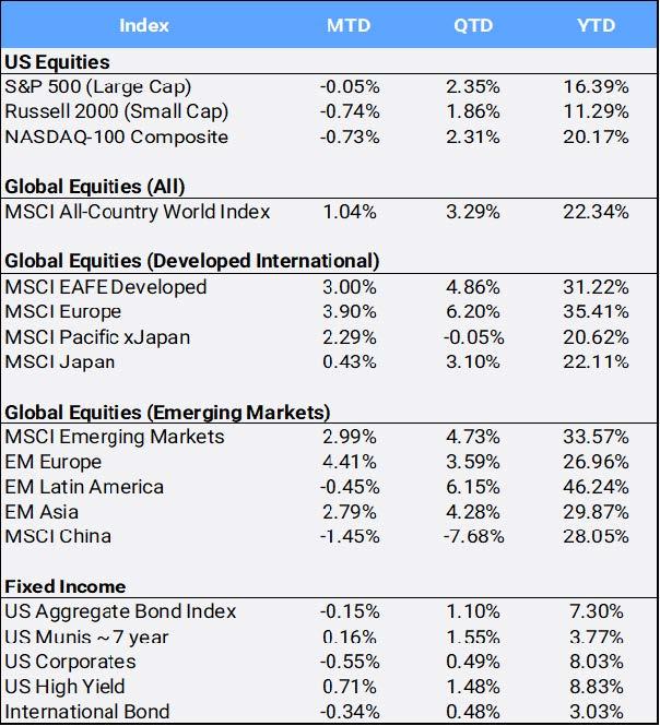 International markets powered the ACWI higher in 2026 with EAFE developed markets up 3.00% MTD, 4.86% QTD and 31.22% YTD (its best year since 2009 following the Great Financial Crisis) and Emerging Markets up 2.99%, 4.73%, and 33.57% (their best year since 2017) correspondingly.